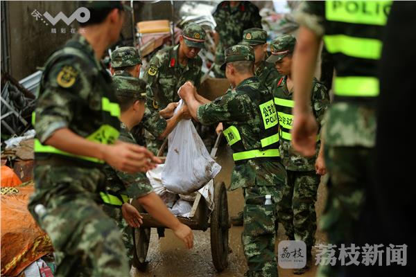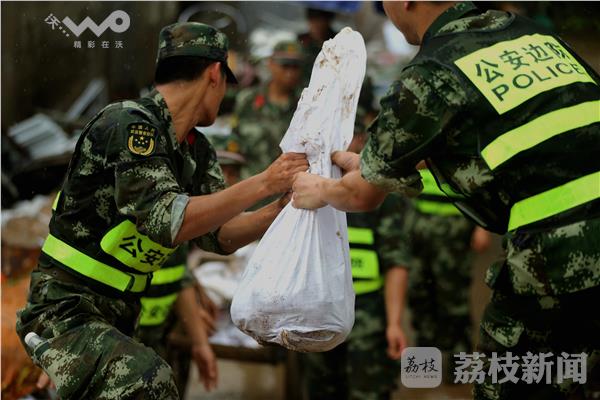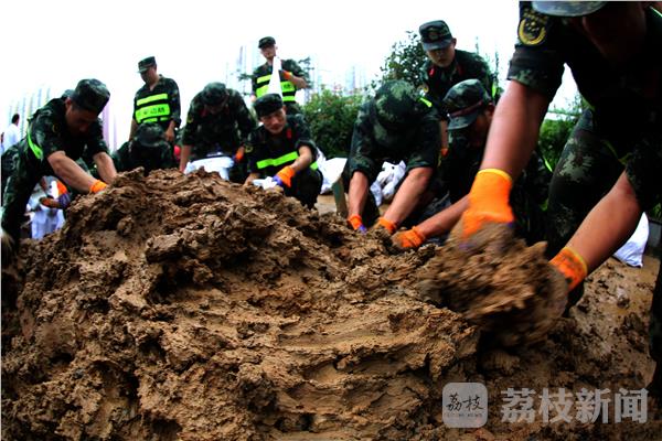作为此次抗汛先头力量,江苏公安边防总队训练基地迅速集结40余名官兵组成突击队最先赶赴现场,科学分配警力为铲沙、运输和排洪三个战斗小组,迅速展开救援。随后赶来的军事监狱及弹药修理所的解放军与先头部队一起,近百余名官兵奋战在南河桥堤渗水灾情严重区域进行加固。