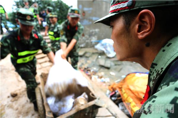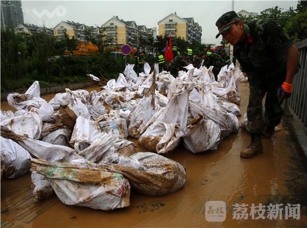 连日来,苏南地区普降暴雨。南京市内部分河流水位迅速上涨。受持续强降水影响,7月4日中午,位于雨花台西善桥的秦淮河支流南河已过警戒水位,情况十分危急,驻地边防武警和解放军官兵紧急出动,驰援抗汛一线。