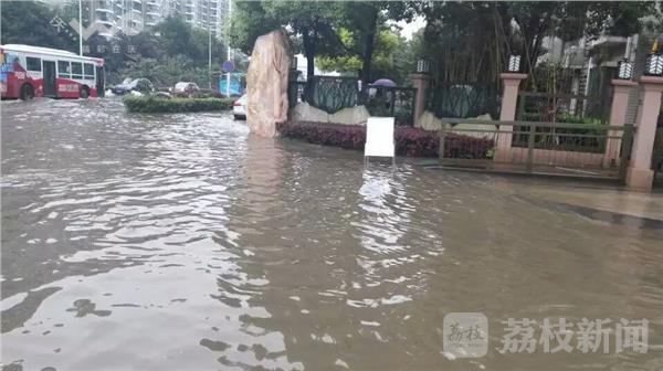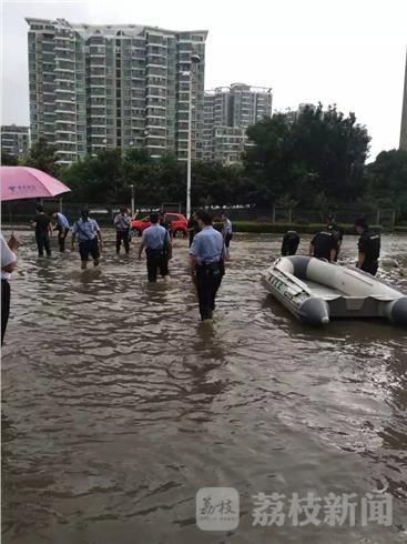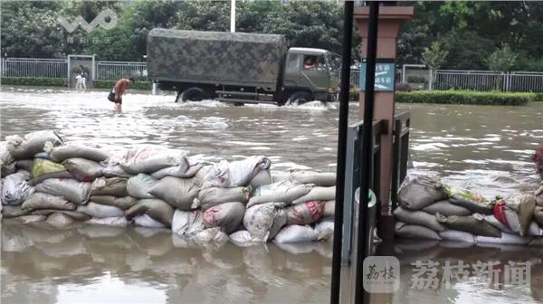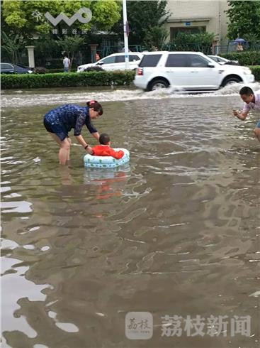 也有市民在水中拍摄照片。接到抢险指令玄武区公安特警、民兵紧急抢险垒沙包,目前相关部门正在加紧排水,截止记者发稿,小区内的水已经明显退下。