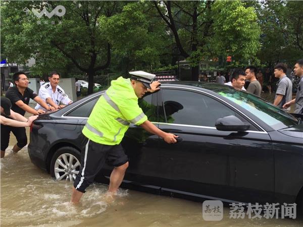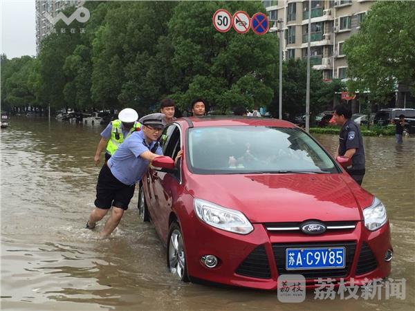 受附近河水倒灌影响,胜利村路、后标营路积水严重,目前最深处可达1.2米。大量车辆被淹,南京交警一大队自早晨5点开始组织警力26人现场进行交通管制,帮助抢险。