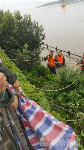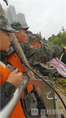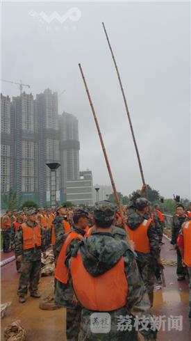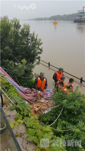 从昨天(5日)夜里到今天上午,树人中学江堤的抢险一直在持续着。从昨天开始,东部战区某舟桥旅的官兵尝试用土工膜防渗法,来排除险情,但是效果并不理想。目前对这一江段的密集抛石已经持续了两天,对大堤沉降的体检监测也已经开始。