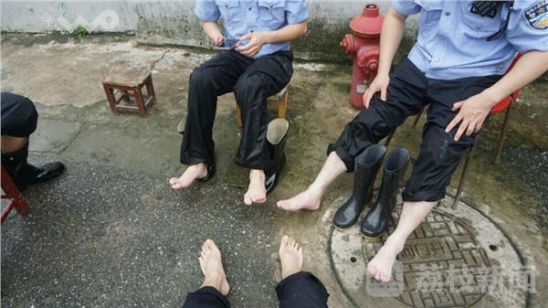 接到险情后,龙潭派出所迅速组织警力前去救援,至现场查看群众家中淹水情况,并转移部分群众至安全地带后,又迅速与附近群众一起就近装沙袋,巩固漏水堤坝,险情得以缓和,便民河水不再外流,然而民警并没有放松心情,立即挨家查看是否有受困群众,确认每一位群众的安全。这时,坐在岸边观察水情的民警才想起泡在水里的双脚,由于积水过深,胶靴里被灌满了水,长期的浸泡,民警的双脚已经泡成了腐白色。