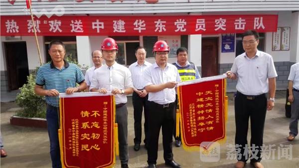 今天(7月7日)上午,阜宁县在陈良镇为中国建筑华东公司党员突击队举行送行仪式,并送上写有“天灾无情人有情、中建精神扬阜宁”“不忘初心、情系灾民”两面锦旗。盐城“6、23”特大风雹灾害发生后,中国建筑华东投资有限公司第一时间派出了25人的党员突击队,到阜宁县抢险救灾,帮助抢救伤员、清理财物、清运粮食和疏通河道,及时帮助受灾群众解决遇到的难题。据了解,他们是灾情发生后进入灾区最早的队伍之一,也是在灾区坚持救援时间最长的队伍。