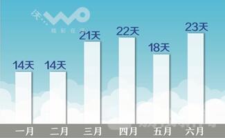 南京环保监测中心监测显示,南京1月份达标天数为14天,2月份达标天数14天,3月份达标天数21天,4月份达标天数22天,5月份达标天数18天,而6月份达标天数23天。优良天数总量达112天,也就是说,6个月来,南京逾6成是蓝天。