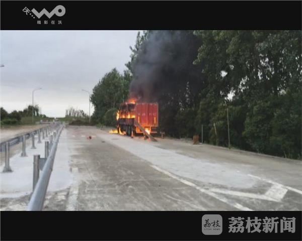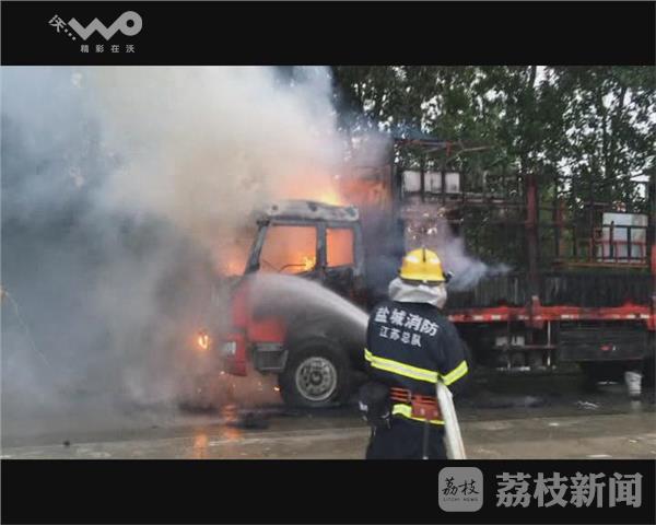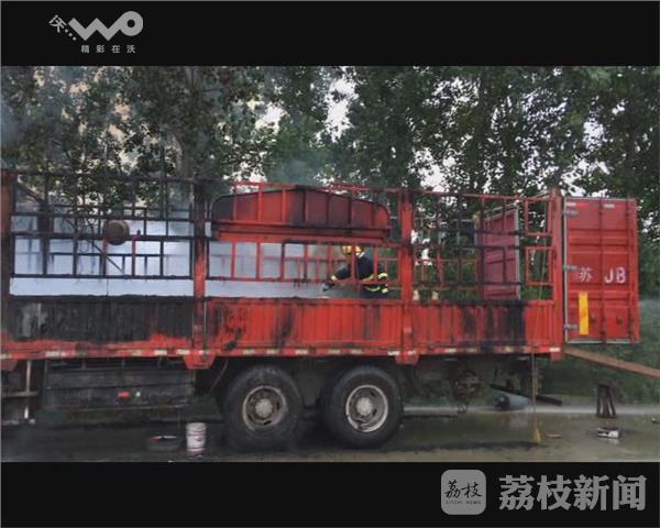 7月11日下午18点30分,在盐城市世纪大道盐城西高速出口旁,一辆停放在道路旁的工程车突然起火,火势迅速蔓延,并很快将整个车辆引燃。赶来的消防队员发现,货车上还存放了两个液化气钢瓶,一只正在猛烈燃烧,还有一只煤气罐在货车车厢中。救援人员立即利用水枪对火势进行冷却控制,同时对车头部位火势进行扑灭。20分钟后,大火被扑灭。