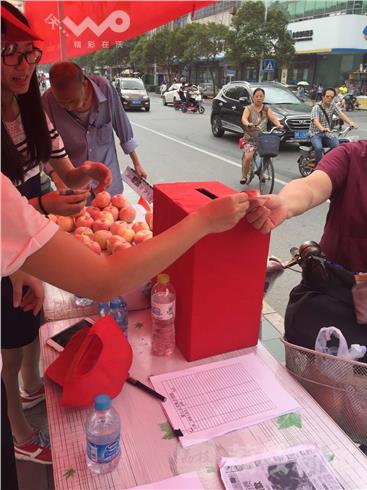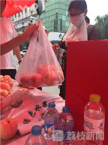 7月12日,一场由扬州大学园植学院志愿者联合亚联果业共同组织的水果义卖在扬州闹市文昌广场及凯德广场同时举办,志愿者们通过义卖苹果的形式为病重的学姐张孝然筹集医疗费。
