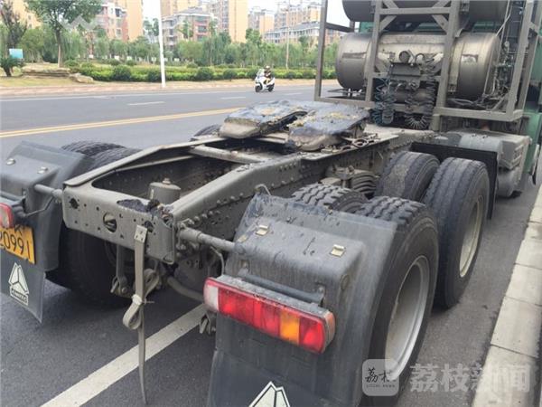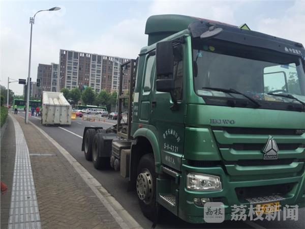 7月13日下午2:00左右,在南京江宁区湖山路,一辆装满天燃气半挂车在行驶途中突然脱落,后面的挂车在地面滑行了7-8米远停下,所幸此次事故未造成气体泄漏。车上随行的押运员下车后紧急关闭了阀门并报警。东山交警中队和上坊派出所民警接警后赶到现场,为防止路过车辆撞上车辆,他们用警车拦住,并在现场指挥交通。