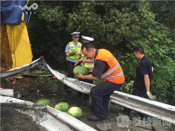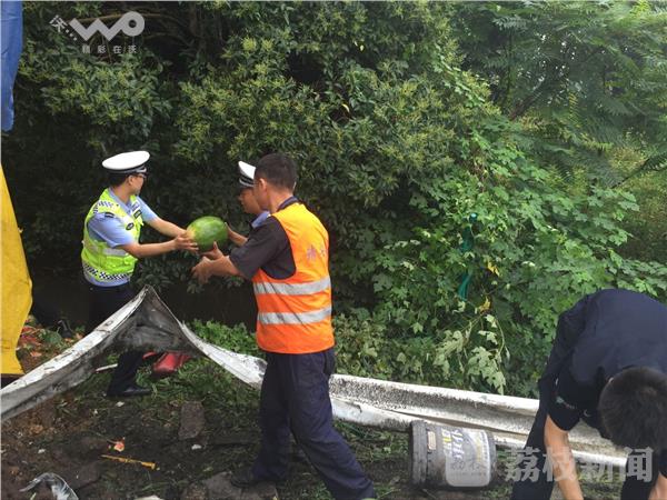 经现场初步了解,驾驶员周某运了一车西瓜准备去外地,因为变道时刹车比较急,加上雨天路面比较湿滑,车辆失控侧翻,在撞坏了好几节护栏以后才停了下来。翻下去的西瓜大多数已经碎掉,在民警的帮助下只捡回部分完好的西瓜,民警告诉周某,下雨时路面湿滑,一定要放慢车速,不能急刹车,否则容易造成车辆失控翻车,幸亏事故没有造成人员伤亡。