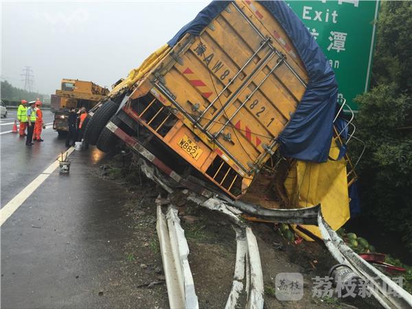 7月14日上午,南京高速一大队值班室接到路过车友报警称沪宁高速麒麟枢纽附近有辆货车侧翻了,民警赶到后发现事故现场一片狼藉,路边的护栏已拧成了麻花状,一车的西瓜也全部翻下高速。