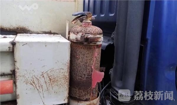 现场看到一辆洒水车停在路边,而司机并不在现场,但是洒水车车头和车尾处有洒水专用的管道接口,地面上也有不少刚洒的水,整辆车车头和车尾竟然没有一块汽车专用牌照,而且洒水车上的车载灭火器锈迹斑斑,罐体上的油漆都已经风化脱落。