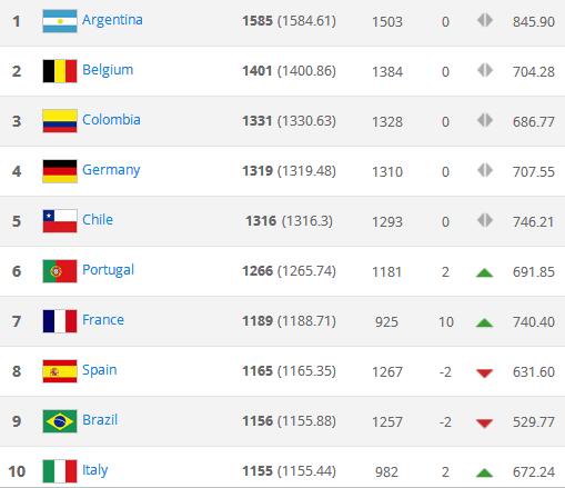 阿根廷在百年美洲杯上获得了亚军,在最新一期FIFA排名上,阿根廷依然排名第1,积分是1585分。比利时排名第2,积分是1401分,在欧洲杯上,比利时仅仅闯入八强,表现差强人意。排名第3-10位的分别是哥伦比亚、德国、智利、葡萄牙、法国、西班牙、巴西和意大利。