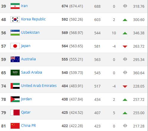 亚洲区,中国男足的FIFA排名是第81位,同上一期排名相比没有任何的变化,亚洲排名第10位,相比上一期下降1位。排名第1-9位的亚洲国家则分别是伊朗、韩国、乌兹别克斯坦、日本、澳大利亚、沙特阿拉伯、阿联酋、约旦和卡塔尔。