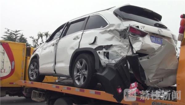 银灰色丰田卡罗拉轿车整个车头损毁严重,车内机油箱,水箱,两侧车灯联通保险杠全部损毁,挡风玻璃被副驾驶乘客撞碎,两只气囊全部弹出,而本田商务车左前侧被撞损毁凹陷,事故中最严重车辆要数丰田越野车,整车在撞击中侧翻甩出180度,车体严重变形,后尾部和车门凹陷变形,气囊和安全气帘全部弹出。