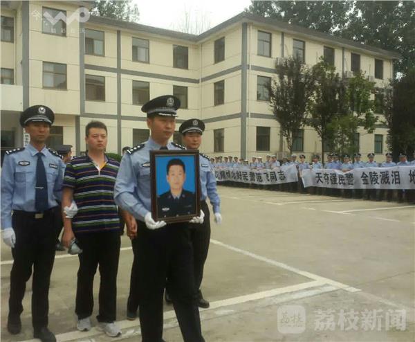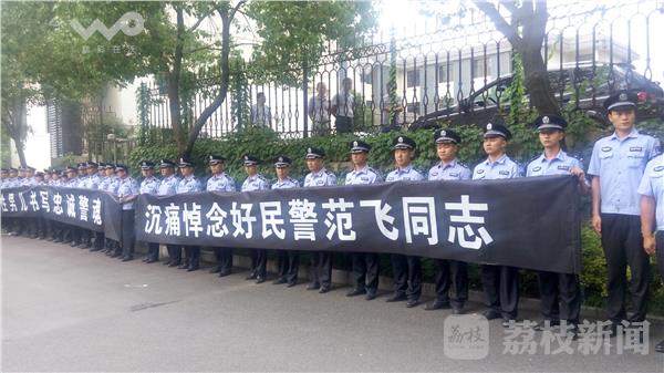 7月16日上午,南京市公安局浦口分局的道路两旁站满了人,民警和自发而来的群众汇集在一起,噙着泪水注视着道路前方,离别的悲伤浮现在每一个人的脸庞。顺着视线的方向,一列车队出现在视野内,一辆端放着遗像的灵车缓缓驶来。车顶上,一张棱角分明、坚毅、睿智的年轻民警遗像吸引了所有人的视线。照片上的民警英气十足,眼神中充满了希翼和期盼。他是南京市公安局浦口分局刑警大队的一名警长,名叫范飞,是个英勇的内蒙古汉子。两天前,他和另一名同事前往湖北侦办一起案件,途经安徽安庆时,因暴雨路滑,不幸发生车祸意外,因公殉职,一个浓墨重彩的生命在绽放之时却提前凋零。