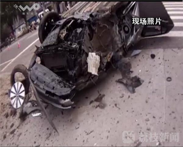 事故现场,一辆灰色的小型轿车底朝天,翻在了江阴市长泾镇长泾交警中队的门口。轿车车身损毁严重,车上的零部件、车轮散落一地,车内的两个安全气囊全部打开。