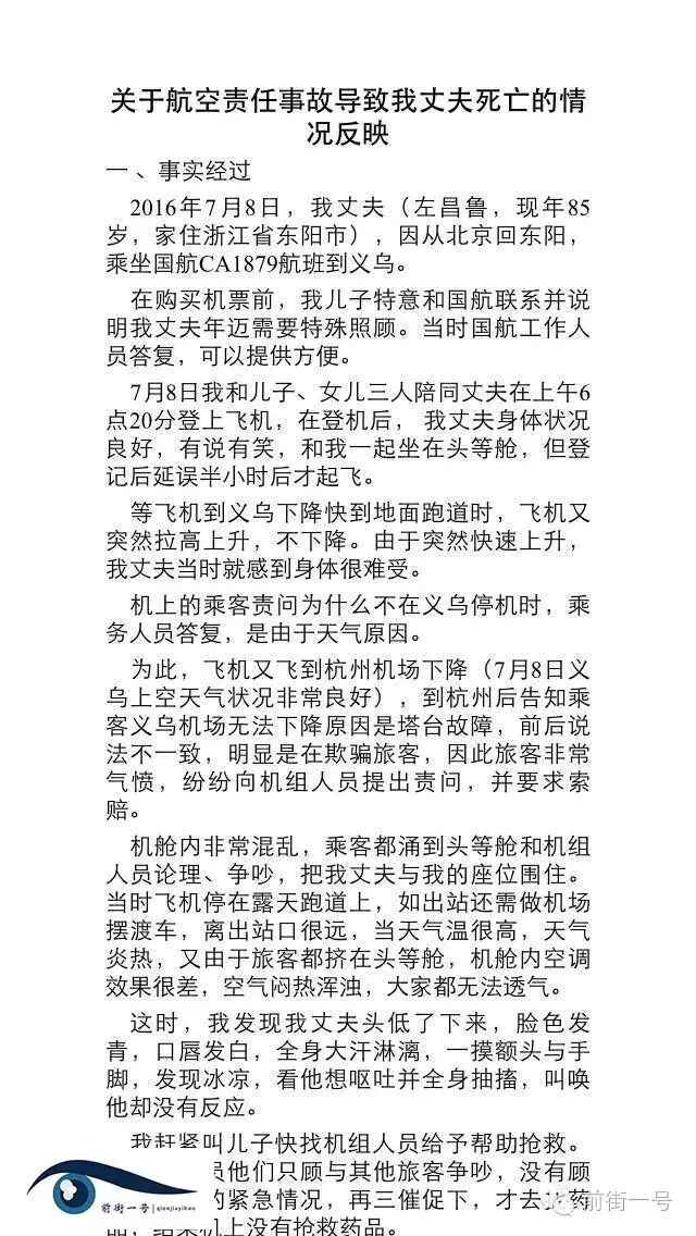 7月8日,国航CA1879航班从北京飞往义乌,飞机到达义乌之后无法降落,备降到杭州机场。多名乘客与乘务人员发生争执,坐在头等舱的85岁乘客左昌鲁出现病症,飞机上缺乏急救药品、氧气设备简陋,延误乘客救治时间,左昌鲁送医后确认死亡。