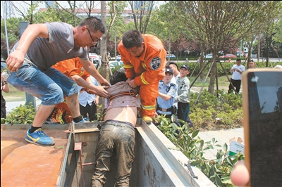 当日上午10时30分许,消防支队指挥中心接到群众报警,有一名施工人员昏倒在崇川区中华慈善博物馆附近的一口井里。10分钟后,1辆消防车、6名消防队员赶到现场。