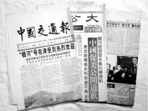 事情是这样的。1993年7月23日,美国以获得情报为由,指控中国“银河号”货轮向伊朗运输制造化学武器的原料,并威胁要对中国进行制裁。8月4日,中国在经过调查后,明确告诉美国:“银河号”没有违禁化学品。美国则声称情报绝对准确,坚持要对“银河号”进行检查。