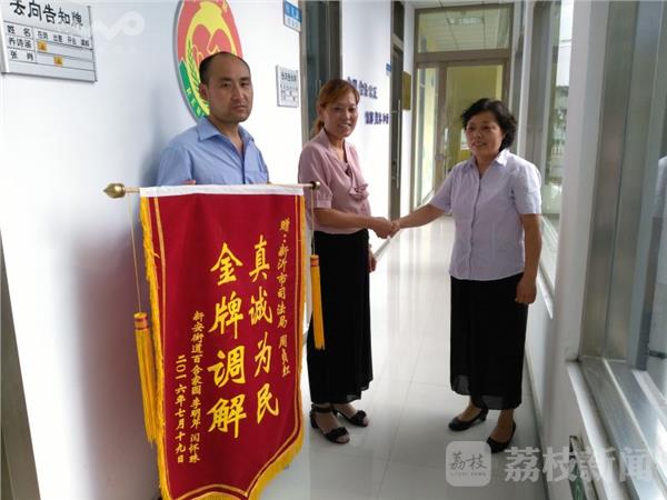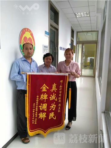 今天上午9时许,新沂市新安街道闫怀珠与李明芹,为该市大调解中心周贞红主任送来一面印有“金牌调解,真诚为民”的锦旗,李明芹握着周主任的手激动地说道:“周主任,要不是你那么认真负责,我们这个家庭可能就要彻底散了,谢谢你们挽救了我们的家庭!”