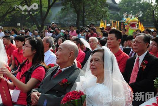 由无锡和深圳携手举办的“首届金婚寿桃盛典”主题公益活动,在江阴顾山镇红豆村举行。来自无锡和深圳的30对金婚夫妻在千年红豆树下互许爱情承诺。他们的子女则用献寿桃的独特方式,表达对父母们50年不老爱情的赞美与祝福。