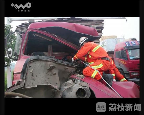 消防官兵到达现场,发现现场一片狼藉,一辆载木板大货车与一辆载线圈货车发生追尾事故,载木板大货车驾驶室严重变形,司机被困在车内,下半身无法动弹。结合现场情况,救援官兵首先利用被追尾的大货车对载木板货车进行牵引,随后消防官兵立即上前,利用破拆工具对变形的驾驶室进行破拆,增大救援空间,15分钟后消防官兵成功将车内驾驶员救出,并立即转交给交警送往医院救治。
