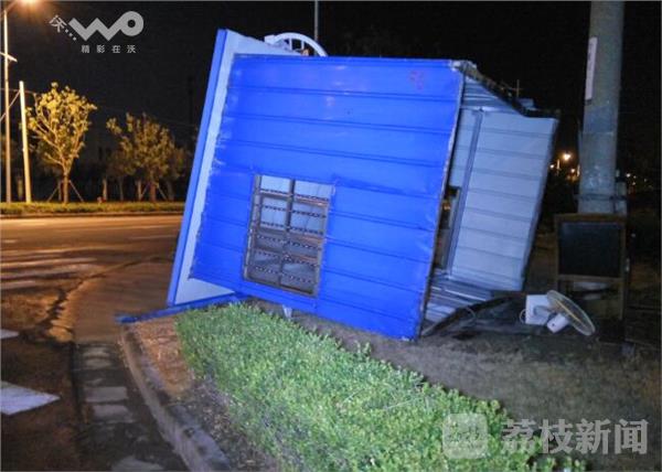 晚上8点荔枝新闻通讯员来到淮安市康庄路看到,这里路边几棵景观树也被狂风拦腰刮断,一处路边彩钢板搭建的活动板房也在狂风中被刮翻,随后当记者来到南苑路看到,路旁绿化带旁一处警示牌也被刮坏,而路中间4棵银杏树也被刮倒在绿化带中,有的拦腰横在快车道上,现场遭受损失最严重的要数勤政路与金华路,在勤政路上看到沿途绿化带中大量树木倒伏,有的倒伏在绿化带中,也有的倒在路上占道,光是勤政路一条路酒就有27棵树木被刮倒。