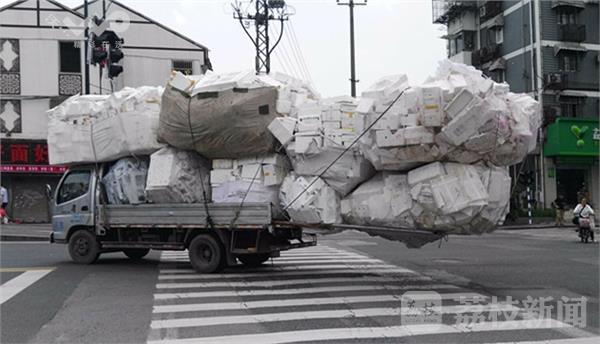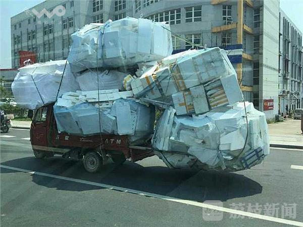 28日上午11时许,在南京浦口发现一辆“加长”机动三轮车,拉着六大包泡沫,从驾驶室车头拖到车尾,装载的货物虽然已经远远超过了车身,看起来就像一座小山,但是车上的货物很轻,只是用几根绳子绑在车上,存在极大的安全隐患。无独有偶,在秦淮区船板巷附近,这辆小货车更是离谱,车头加高,车箱尾部“加长”7-8米,上面装载大量泡沫,如同超长大货车,行驶在道路上,惊呆了不少路人。
