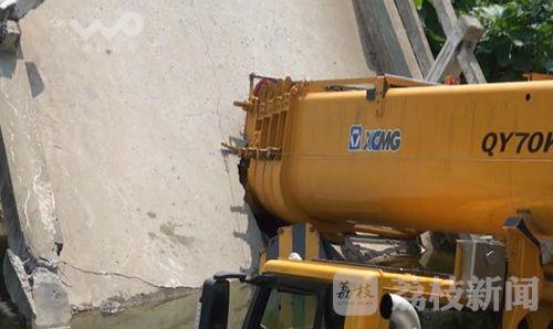 记者赶到现场时,桥的两端已被附近村民用绳子拉了起来,禁止通行。记者在现场目测了一下,整个桥面在二十米左右,已经全部垮塌,桥下的水面宽有十七、八米,一辆黄颜色的起重吊车车头朝东趴在南北走向的河道里,吊臂将桥面捣开一个洞,插进了桥面,车后的尾灯还亮着。惊魂未定的吊车驾驶员告诉记者,以前他驾驶吊车也从这桥上走过,今天早上开车走这里去工地时,桥就突然垮了,没有造成人员伤亡。一名站在桥边的妇女告诉记者,吊车是她家的,今年才买时间不长。