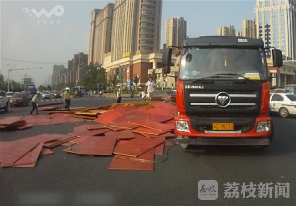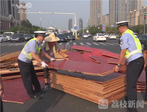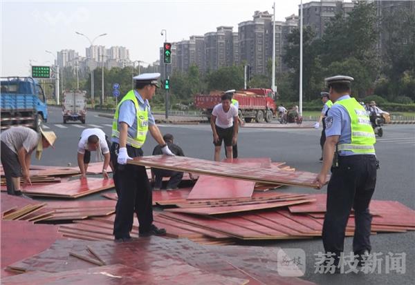7月29日下午4点多钟,一辆满载板材的大货车,在途经徐州经济开发区104国道和206国道的交汇处时,由于转弯过急,一车的板材被从货车上甩出,散落一地占据了路口的大半幅路面。当时路面足有40多度,巡逻路过的开发区交警冒着高温帮忙清理散落的板材。