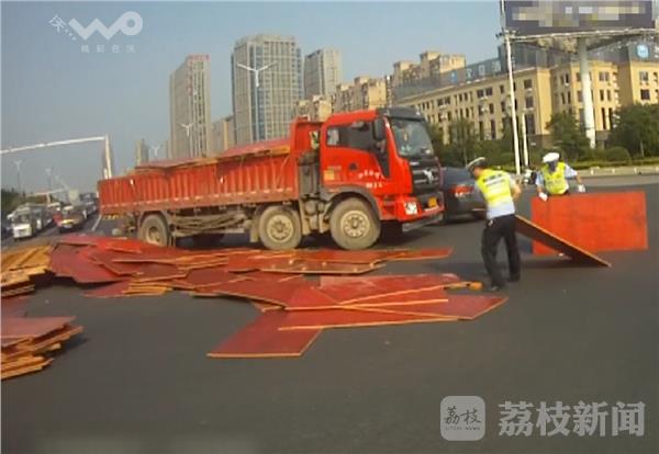 荔枝新闻通讯员在现场看到,一辆红色大货车停在路口中央,货车的旁边散落一地的板材,洒落的板材占据了大半幅路面,严重影响了路口车辆的通行。几名巡逻路过的开发区大队交警正在帮助货车司机清理现场。