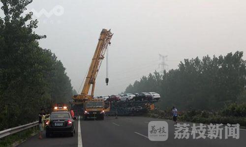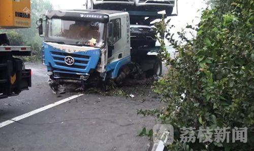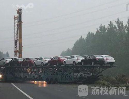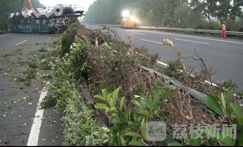 7月30日凌晨4点钟左右,在沈海高速盐城射阳县兴桥出口南侧三公里处,一辆由南向北、满载轿车的超长货车突然方向失控,将路中央的隔离护栏撞毁十多米后,冲到对面车道撞上路边护栏后才停下来,横停在由北向南的车道里,占据三股机动车道和一股应急车道,导致往盐城、南通方向的车辆大量积压,事故车辆车头部分损毁严重,驾驶员受伤。