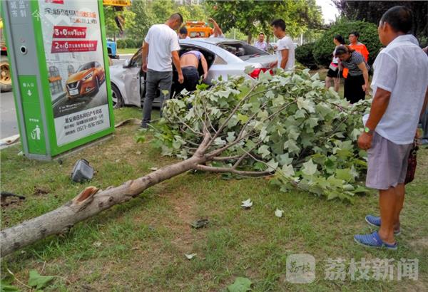 现场站满许多围观群众,在路口南侧绿化带上一棵梧桐树倒下了,而被撞倒梧桐树南侧绿化带上一辆轿车侧翻在地,轿车右侧损毁严重,全车前后挡风玻璃破损严重,整个车体变形严重。