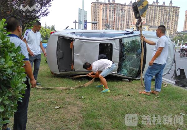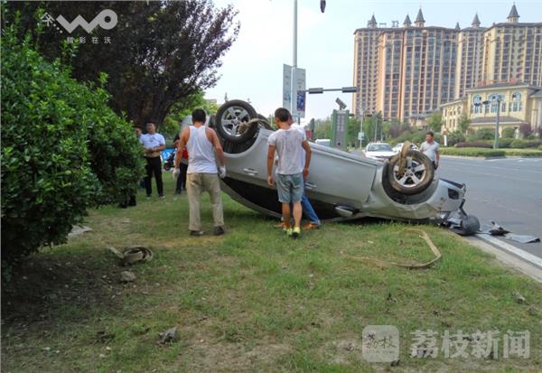 7月29日下午2:30分左右,淮安市明远路与通甫路交叉路口处发生惊险一幕,一辆银灰色科鲁兹轿车在避让一辆电动车过程中猛打方向冲上路边绿化带撞飞一棵梧桐树后侧翻在绿化带上。