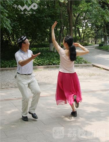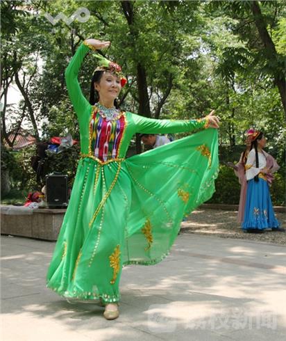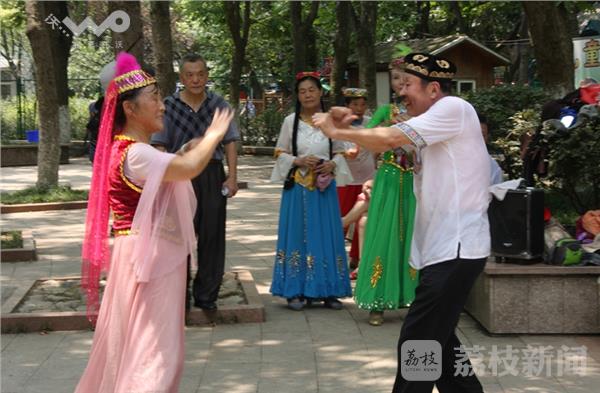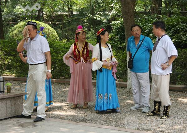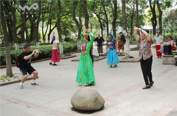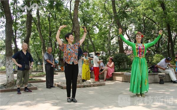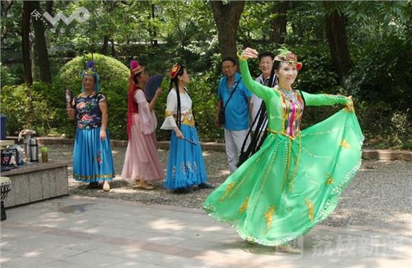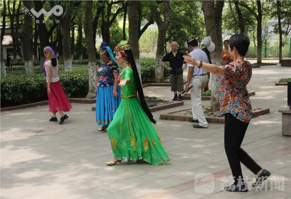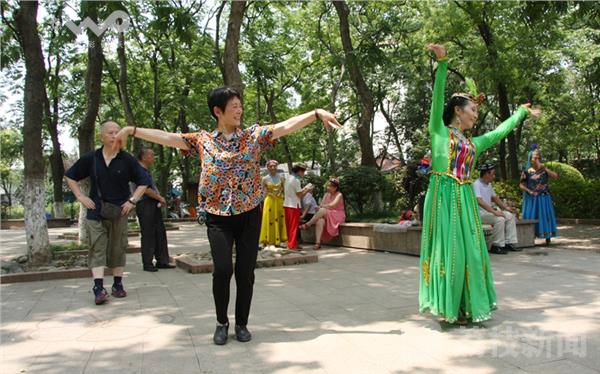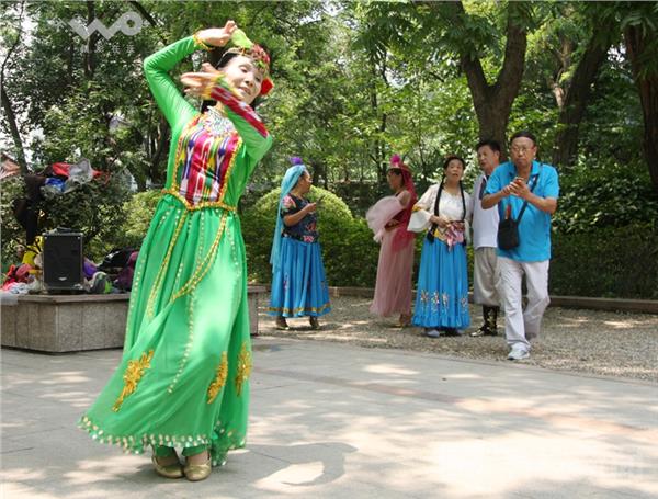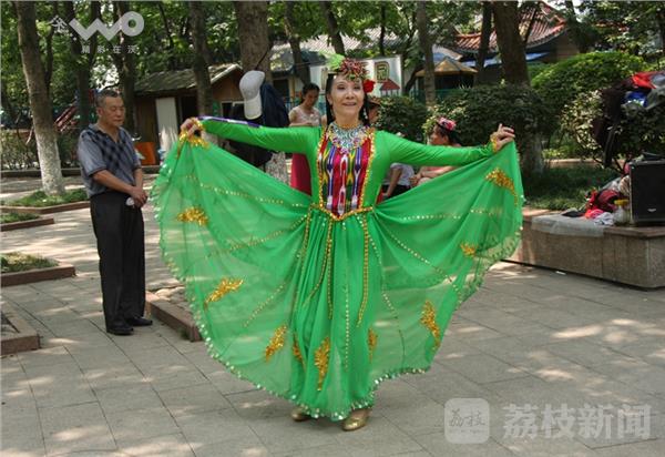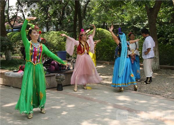 今天(7月31日)中午,骄阳似火,南京城的最高温度高达38度。然而,在莫愁湖畔,仍有一群身着新疆民族服装、年愈花甲的老人们在翩翩起舞。虽然,天气高温,汗水湿透了他们的衣服,但他们的依然穿戴整齐、舞姿优美而强劲。一支舞毕,便会引来众多游人的掌声和欢呼声。