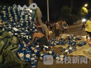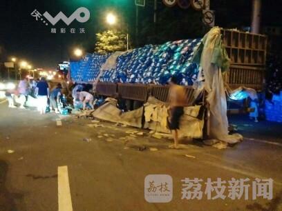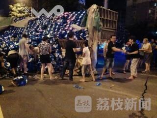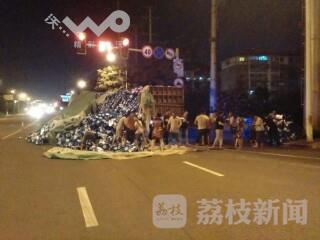 7月31日晚20时许,南通市崇川区跃龙南长江南路口一辆满载饮料的货车货物洒下来了,导致路面堵塞,事故发生后,现场很多群众自发帮司机捡拾散落在路面的饮料,无一人哄抢。