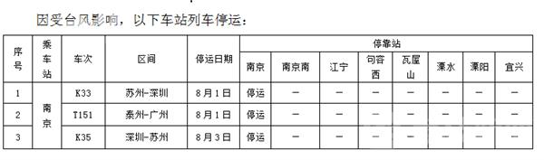 而荔枝新闻记者从上海铁路局获悉,受“妮妲”台风的影响,8月1日,3日,由江苏苏州、泰州市至广州、深圳的3趟列车停运(见图)。