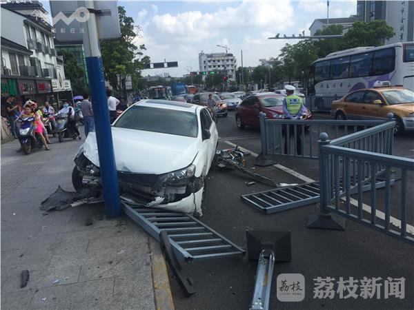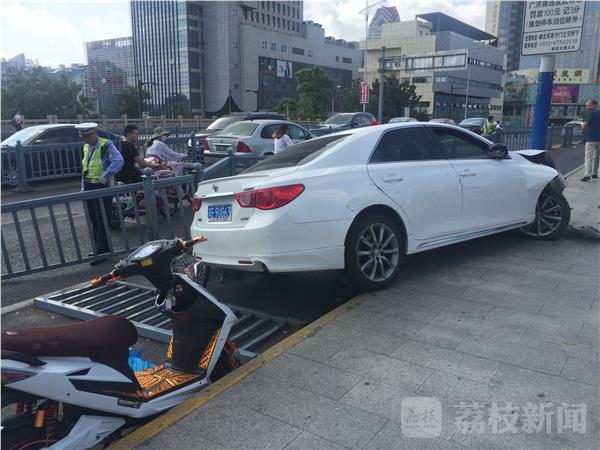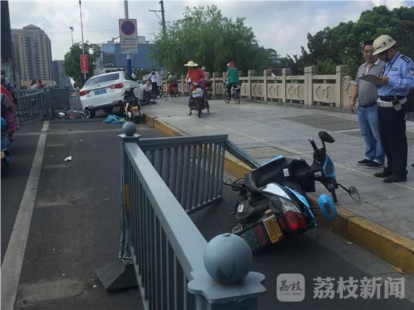 今天早上8点多,苏州广济桥上发生一个车祸,一辆丰田车失控撞断广济桥上的护栏,随后冲到人行道上,直到冲到人行道上的路牌指示杆上才停了下来。丰田车车头严重受损。