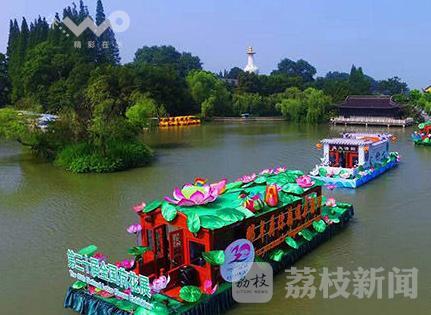 7月31日,第30届全国荷花展在扬州瘦西湖风景区开幕,在瘦西湖万花园水域,四条荷花船用逼真的荷花荷叶装扮,从小金山附近水面开始,经过钓鱼台、凫庄、五亭桥,二十四桥等景点水域巡游,构成瘦西湖水上最美丽的流动风景,也给市民与游客带去“荷叶五寸荷花娇,贴波不得画船摇”的美妙感觉。