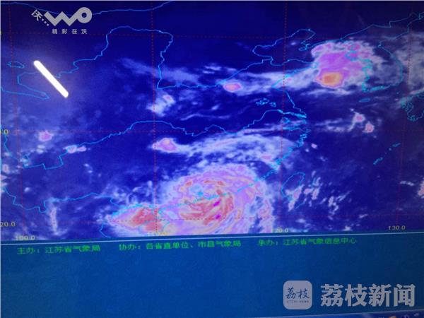 记者许薇:“我现在的位置是在江苏省气象台,从我旁边的大屏可以看到,现在台风妮妲的中心位置是位于我国广东省的中山市和东莞市之间,从它的路径来看呢,它将以每小时20公里的速度向西偏北的方向移动,预计在24小时之后达到广西的柳州市。”