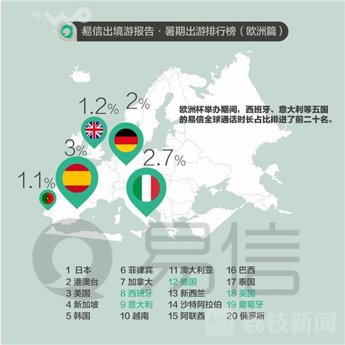 各色运动赛事也成为用户选择出游目的地的影响原因,欧洲杯的东道主法国就是今年最热门的欧洲国家之一。即将开幕的奥运会预计会产生拉动作用,因为在易信国际漫游统计的数据中,巴西是唯一排进前20名的南美国家。
