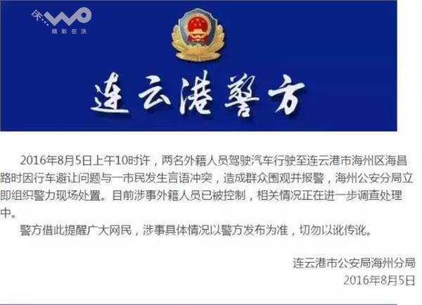 2016年8月5日上午10时许,两名外籍人员驾驶汽车行驶至连云港市海州区海昌路时因行车避让问题与一市民发生言语冲突,造成群众围观并报警,当地警方立即组织警力现场处置,目前涉事外籍人员已被控制,相关情况正在进一步调查处理当中。