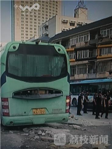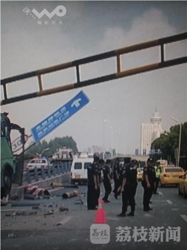 荔枝新闻记者看到,该路口右侧直行是通往火车站南广场及龙蟠路隧道,左侧则是通往火车站接送客二层平台的高架入口。大客车直接开到了中间的分隔带上,骑着分隔带开出近20米直至被卡,期间先后撞断设置在分隔带上的交通标牌杆,限高架桩。