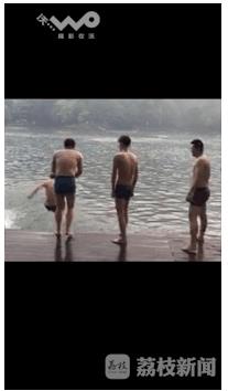 八名跳湖的男子穿着短裤,光着身子,随后,随着带队人的一声令下“跳湖!”,8个人一起跳入紫霞湖的湖水中。