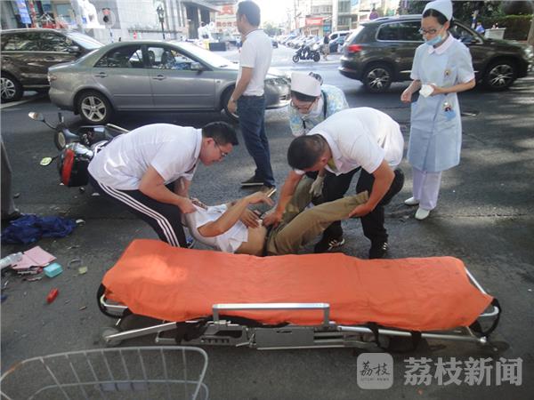 据目击市民介绍,私家车属正常行驶,而电动车可能是闯红灯,因交通十字路口双方疏于观察产生了碰擦。事故发生后私家车驾驶员分别打电话110、120、122报警,十分钟后120到达现场,经询问当事人后将其抬上担架送医。