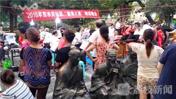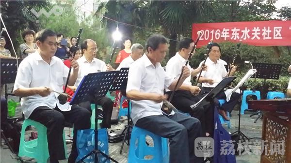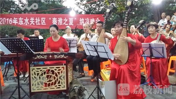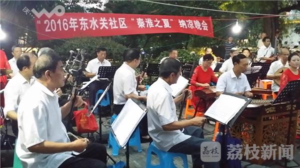 据荔枝网友了解,东水关社区每年都要举办'秦淮之夏'纳凉晚会,现在已经举行了五届,目的是为了用先进的文化占领社区阵地,活跃社区居民的业余文化生活。得知今天晚上社区举办一年一度的纳凉晚会,许多上了年纪的社区居民和孩子们早早的吃过晚饭前来占位置。除小区居民参加表演节目外,社区还邀请了秦淮秦韵民乐团为晚会担任伴奏。演出的节目有女声独唱《好日子》、男声独唱《最美的歌献给妈妈》、男女声对唱《敖包相会》、笛子独奏《扬鞭摧策马运粮忙》、二胡齐奏《赛马》、民乐合奏《喜洋洋》等。每个节目结束都受到了在场观众的热烈掌声。