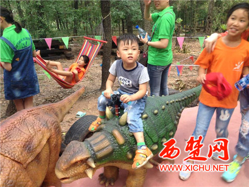 经过一个多小时的车程,孩子们抵达了首站旅游景点-新沂市马陵山公园。刚走进公园,孩子们就看到很多模型恐龙,激动地跑过去和“恐龙"零距离接触。