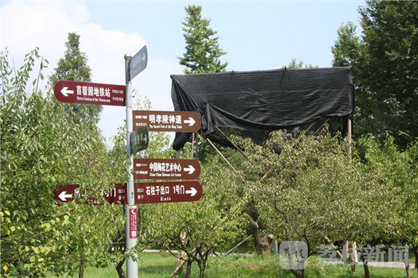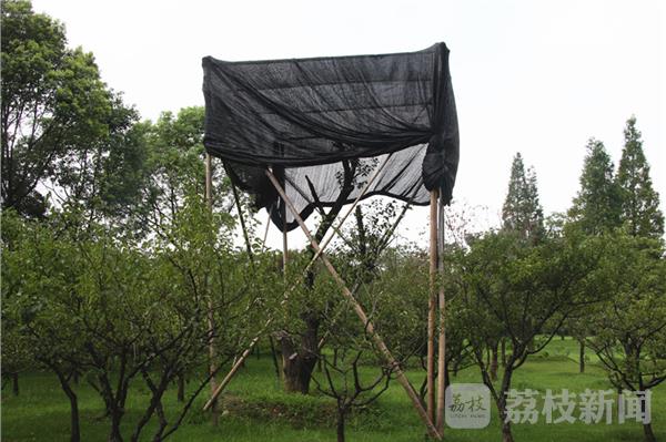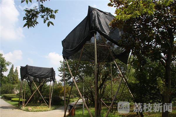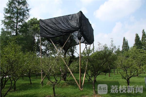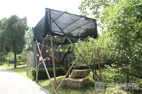 今天(8月10日)上午,烈日炎炎、骄阳似火。荔枝新闻网友在南京东郊梅花山看到,景区内有十多棵梅花树的上方支起了“遮阳棚”,而这些梅树则在遮阳蓬内安然地纳凉。