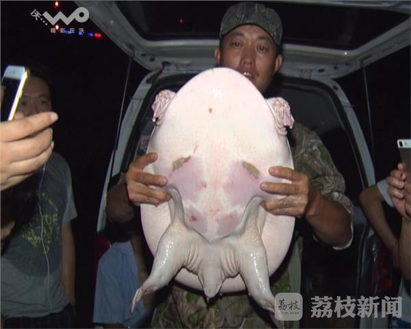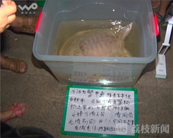 8月11日晚上8点钟左右,有市民报料,在浦口明发滨江新城,靠近长江大桥北桥头堡下面的大梗上,有人在叫卖一只罕见的野生大老鳖,也叫甲鱼,有20斤重左右!要价6800元钱,现场看到有好多人在围观,老鳖被放在一直大塑料四方桶里面,旁边还摆着一块有说明牌子,这只老鳖长有60公分左右,宽有30公分左右,颜色与普通老鳖不同,有点发白的金黄色,背上有两种颜色,好多市民也说没有看见过这么大的老鳖,据卖鳖的张师傅讲,他是下午在长江里面,用老鳖钩子钓上来的,自己钓老鳖已有18年了,以前也钓过比这个还大的,这是正宗的长江里面野生大老鳖,应该有好多年了,具体是什么品种自己也说不清楚!