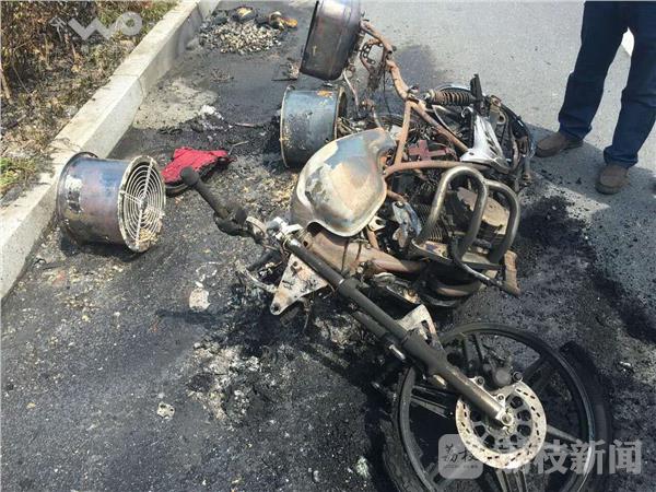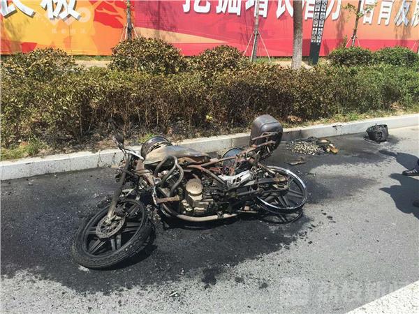 据驾驶员介绍,今天上午他从盐城送四台风机及配件到大中农场,途径226省道西郊公园东大门时,发现摩托车起火,随即将摩托车停下并倒在地上,立即下车将车上的东西往下拿,可是刚下车,摩托车油箱爆炸,大火将摩托车及车上的四台风机和配件烧毁,所幸人无大碍。