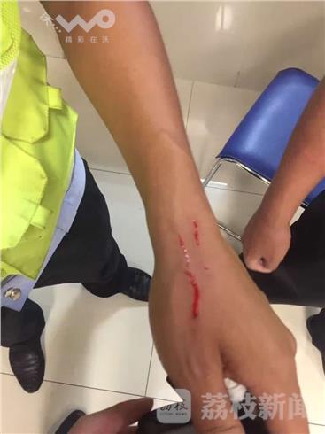当交警一大队民警拦下后,当事人坚决不认为自己有错,而且拒绝缴纳罚款。在执法过程中先前坐在电动车后座的环卫工人用指甲抓伤民警和警辅手臂,并想用牙咬民警,但没有得逞。因为当事人非常不配合处罚,而且拒不缴纳罚款。民警孙超准备对车辆进行暂扣时,驾车男子突然从电动车内拿出一把菜刀架在自己脖子上,声称“你只要扣我车,我就当场自杀”。现场男子情绪非常激动。随后刀被民警合力夺下,控制住男子随后将两人送至南京锁金村派出所处理。